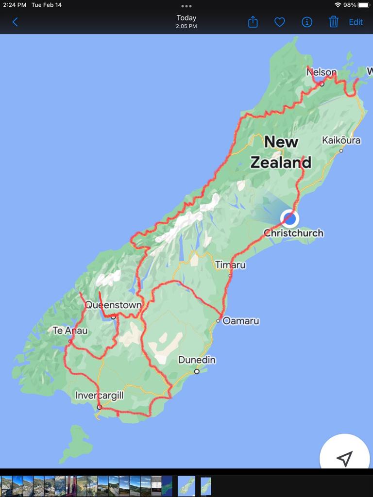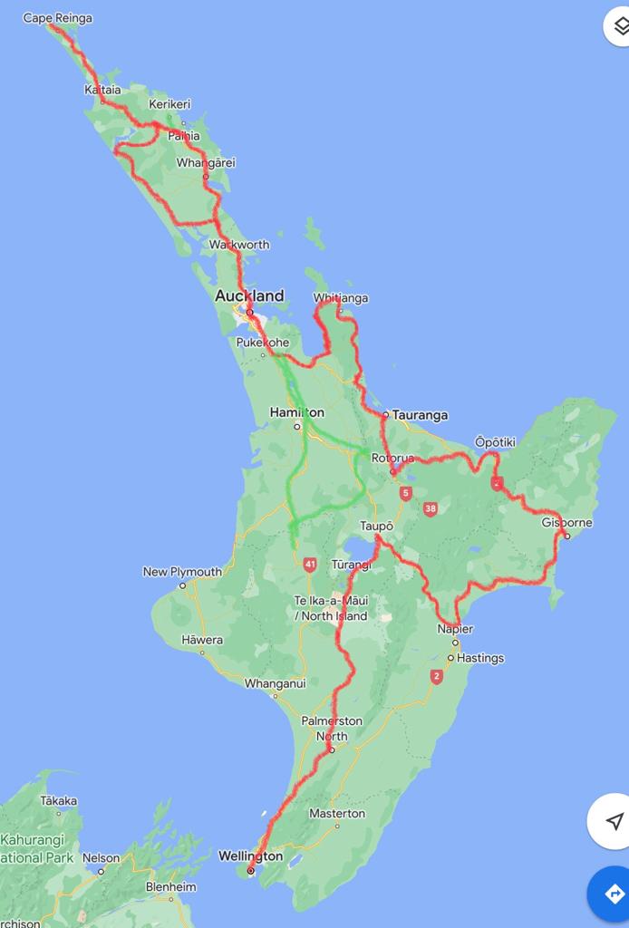 Just in case you were wondering, we had 11 legs on the north island, totalling 2462 kilometres (an estimated 2985 km driven including all the extras).